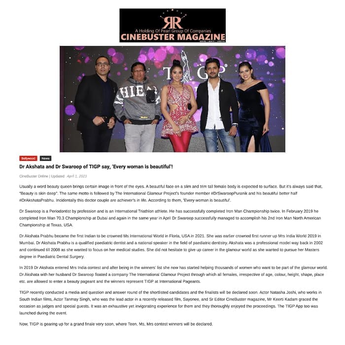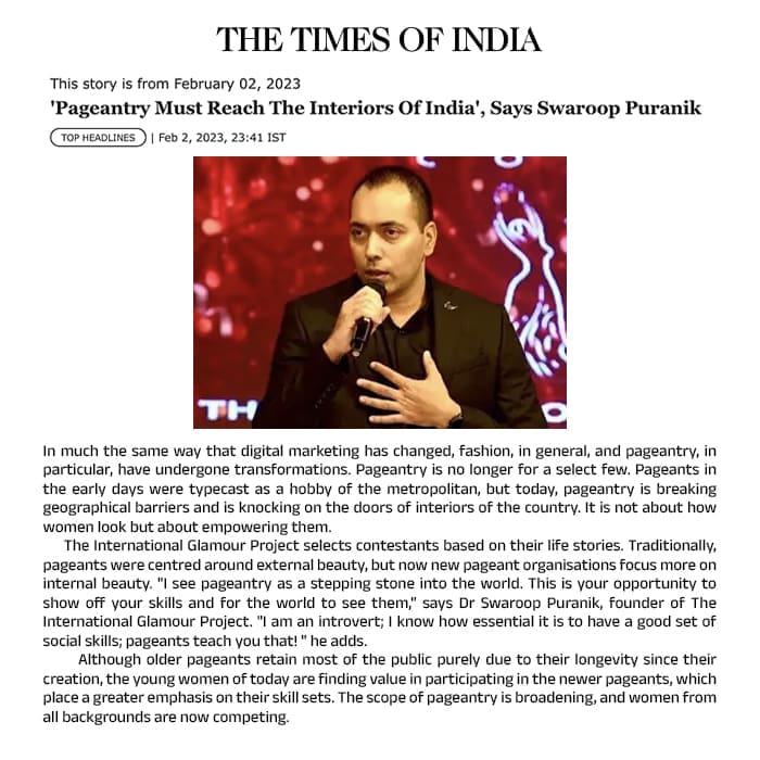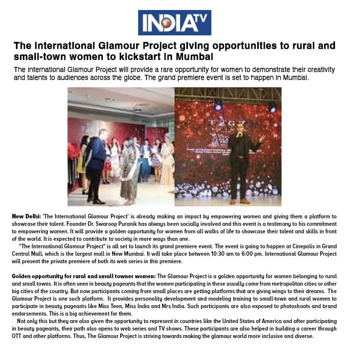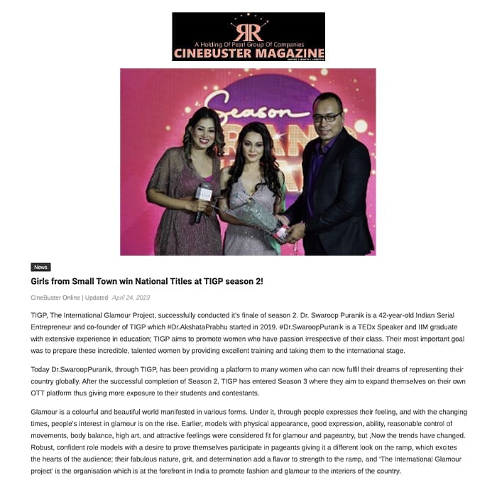 TIGP is an Indo – US alliance dedicated to discovering and nurturing Fresh talent across three age categories – Miss Teen India, Miss India and Mrs India providing an ‘Ecosystem of Women Empowerment and Leadership’ through Fashion, Media and Pageantry. With an in-house Training and Grooming Academy, we empower individuals to achieve their goals and dreams. Be it representing India on an International Platform as a Beauty Queen, to be the face of a Brand or walk prestigious Fashion Weeks or become a Public Speaker or step into Bollywood and the Entertainment Industry.